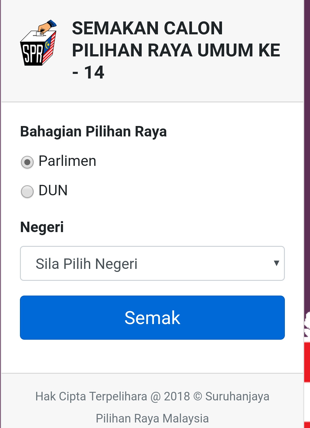 Pilih saja parlimen atau DUN yang nak disemak. Dan seterusnya klik semak. Senarai calon akan dipaparkan.